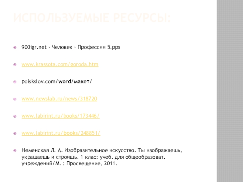 Используемые ресурсы: 900igr.net › Человек › Профессии 5.ppswww.krassota.com/goroda.htmpoiskslov.com/word/макет/www.newslab.ru/news/318720www.labirint.ru/books/173446/www.labirint.ru/books/248851/Неменская Л. А. Изобразительное искусство. Ты изображаешь, украшаешь и строишь.