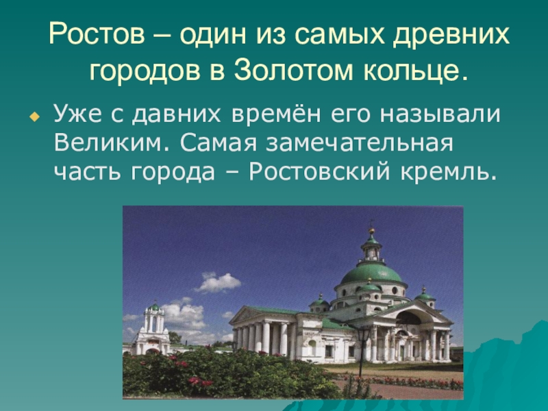 Слайд 6Ростов – один из самых древних городов в Золотом кольце.