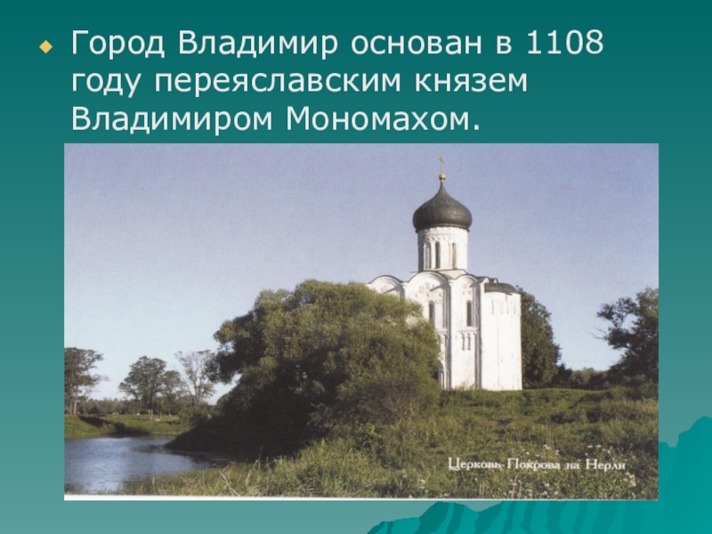 Город Владимир основан в 1108 году переяславским князем Владимиром Мономахом.