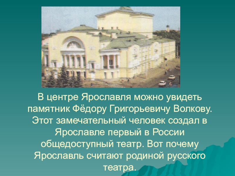 Слайд 12 В центре Ярославля можно увидеть памятник Фёдору Григорьевичу Волкову. Этот замечательный