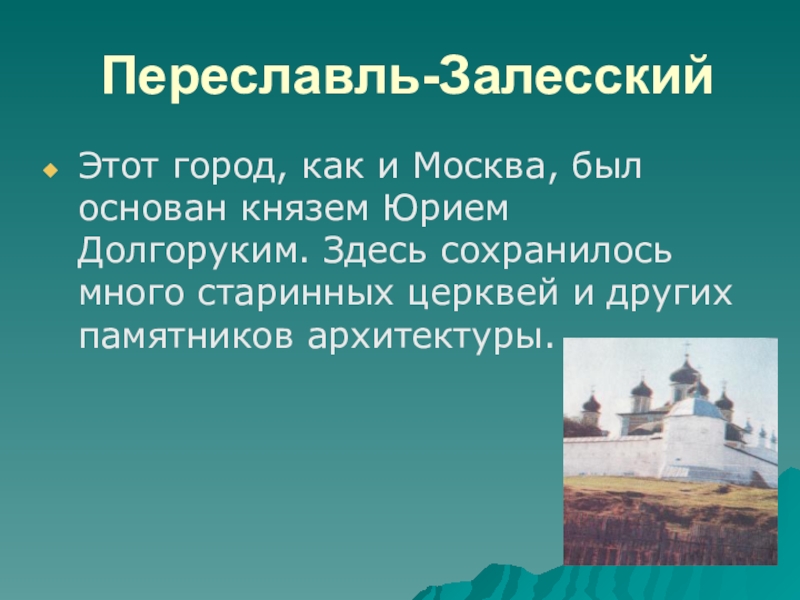 Переславль-ЗалесскийЭтот город, как и Москва, был основан князем Юрием Долгоруким. Здесь сохранилось много старинных церквей и других