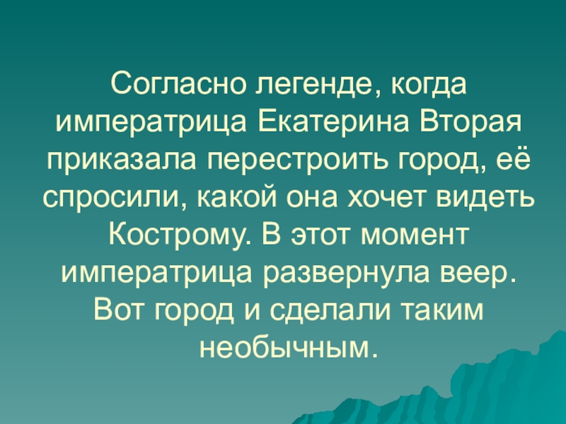 Слайд 14Согласно легенде, когда императрица Екатерина Вторая приказала перестроить город, её спросили,
