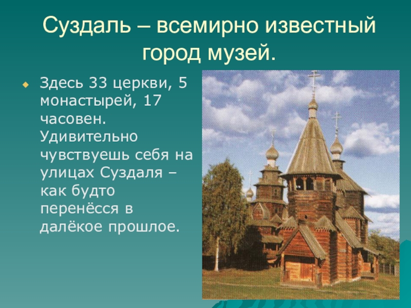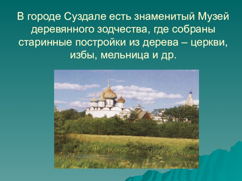 Слайд 18 В городе Суздале есть знаменитый Музей деревянного зодчества, где собраны старинные