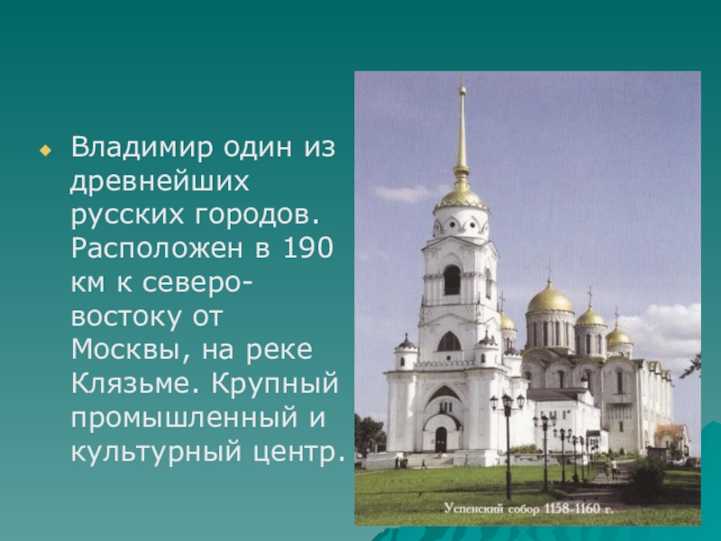 Владимир один из древнейших русских городов. Расположен в 190 км к