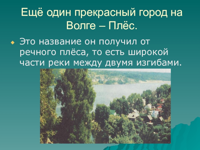 Ещё один прекрасный город на Волге – Плёс.Это название он получил от речного плёса, то есть широкой