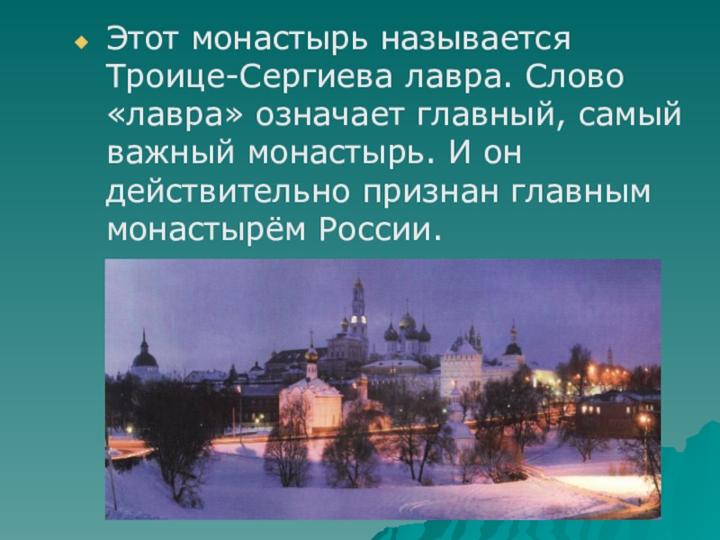 Этот монастырь называется Троице-Сергиева лавра. Слово «лавра» означает главный, самый важный монастырь. И он действительно признан главным