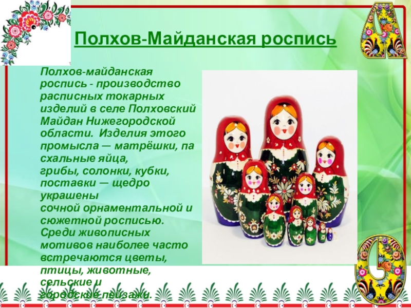 в селе Полховский Майдан Нижегородской области. Изделия этого промысла — матрёшки, пасхальные яйца, грибы, солонки, кубки, поставки — щедро украшены сочной орнаментальной и сюжетной росписью. Среди живописных мотивов наиболее часто встречаются цветы, птицы, животные, сельские и городские пейзажи.