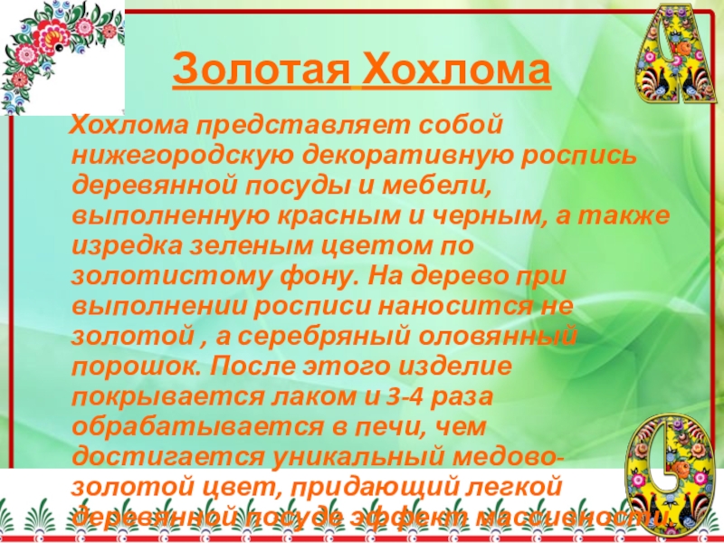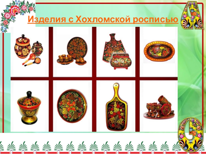 Хохлома представляет собой нижегородскую декоративную роспись деревянной посуды