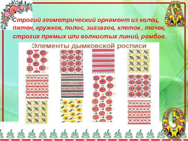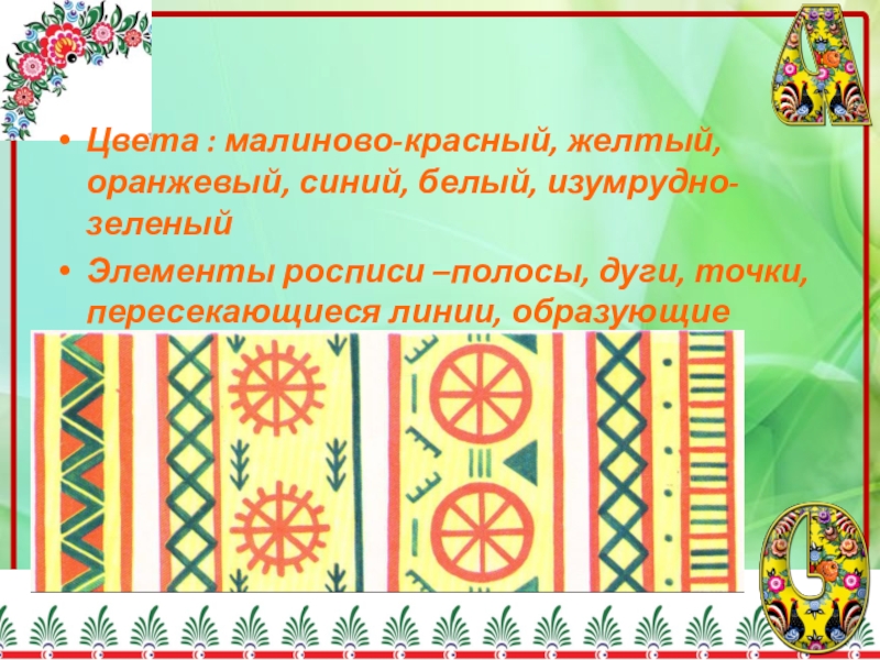 Слайд 15 В росписи значительное место занимает орнамент. Характерный рисунок: