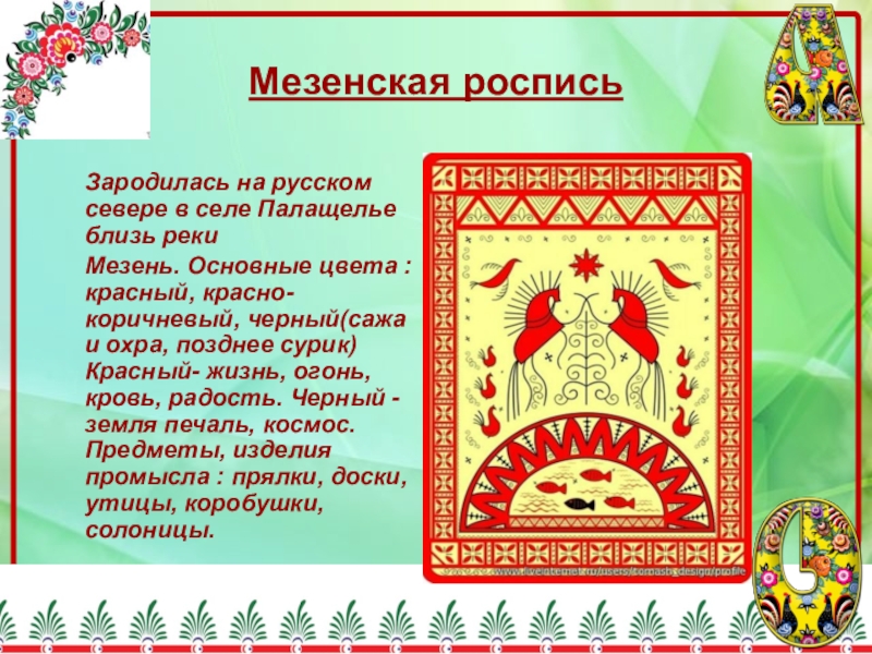 Мезень. Основные цвета : красный, красно-коричневый, черный(сажа и охра, позднее сурик) Красный- жизнь, огонь, кровь, радость. Черный -земля печаль, космос. Предметы, изделия промысла : прялки, доски, утицы, коробушки, солоницы.