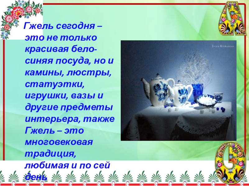 красивая бело-синяя посуда, но и камины, люстры, статуэтки, игрушки, вазы и другие предметы интерьера, также Гжель – это многовековая традиция, любимая и по сей день