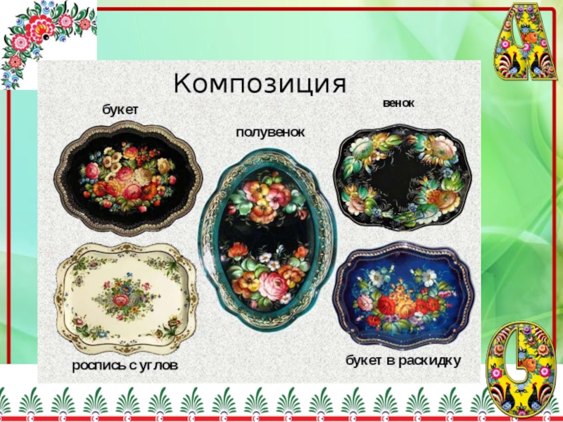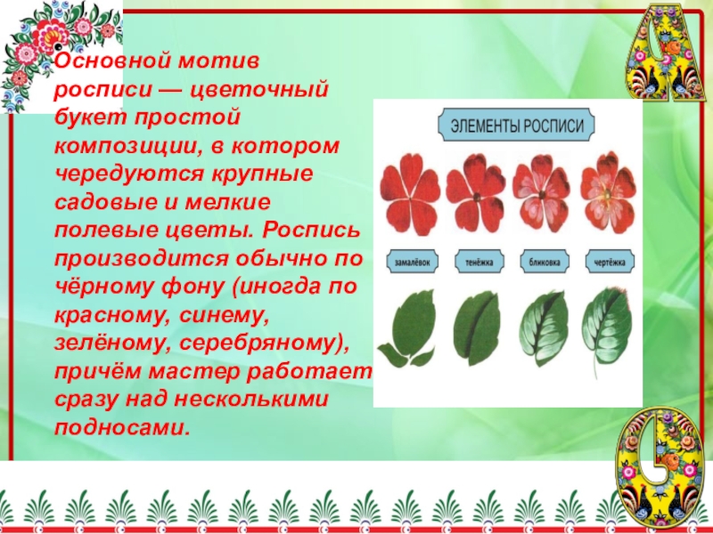 Слайд 10 Основной мотив росписи — цветочный букет простой композиции, в котором