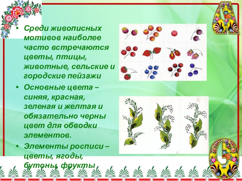 Элементы росписи –цветы, ягоды, бутоны, фрукты