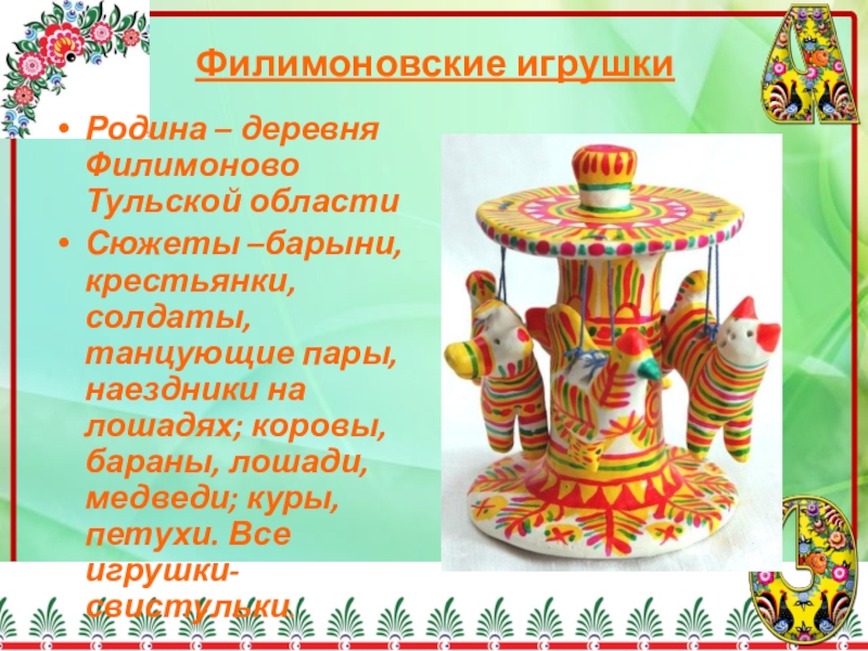 -Виды игрушек –женские образы, мужские образы, животные, птицы, композиции