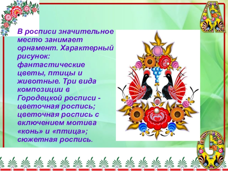 фантастические цветы, птицы и животные. Три вида композиции в Городецкой росписи - цветочная роспись; цветочная роспись с включением мотива «конь» и «птица»; сюжетная роспись.