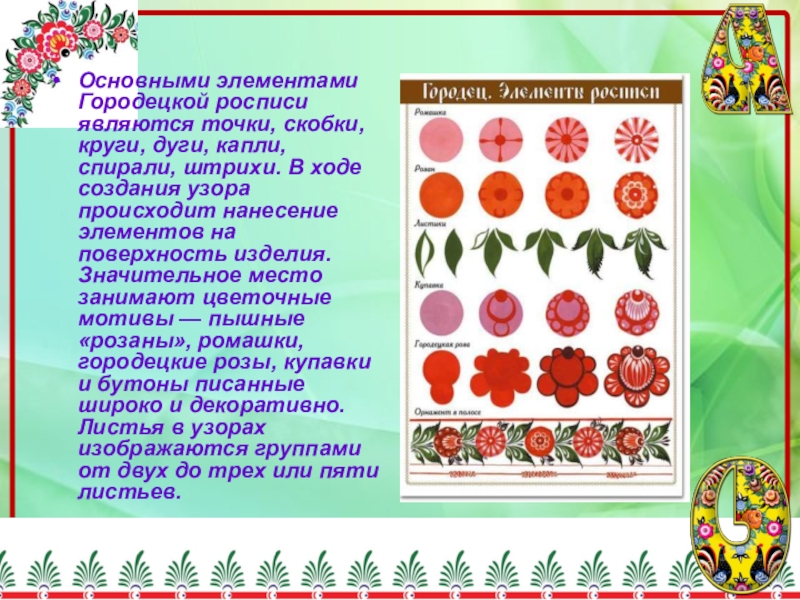 Слайд 16Основными элементами Городецкой росписи являются точки, скобки, круги, дуги, капли, спирали,