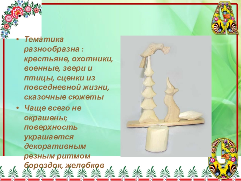Тематика разнообразна : крестьяне, охотники, военные, звери и птицы, сценки из