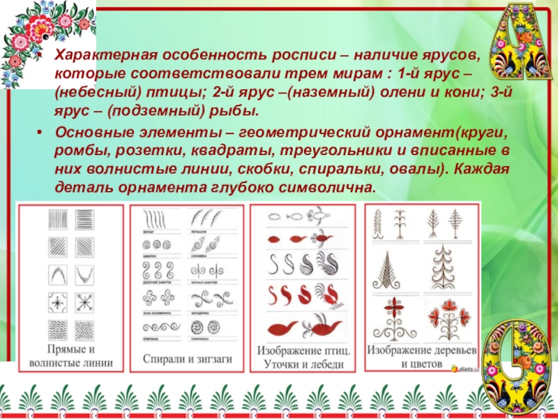 Основные элементы – геометрический орнамент(круги, ромбы, розетки, квадраты, треугольники и вписанные в них волнистые линии, скобки, спиральки, овалы). Каждая деталь орнамента глубоко символична.
