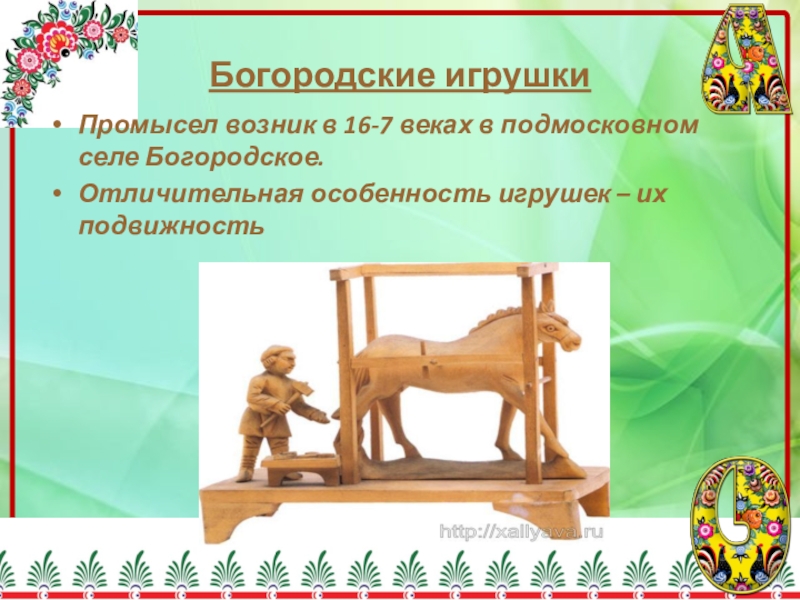 Промысел возник в 16-7 веках в подмосковном селе Богородское.