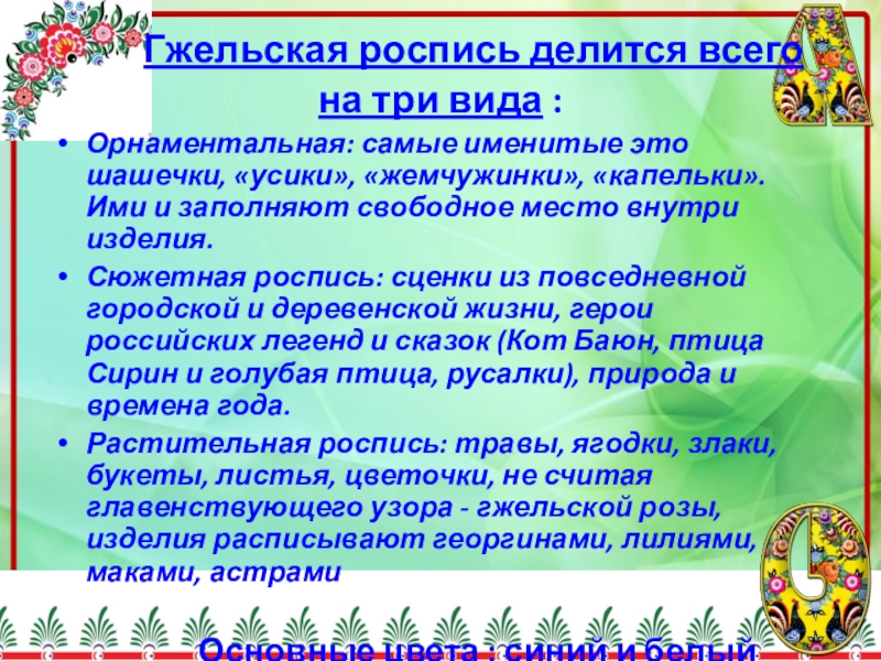 Основной цвет росписи - ярко-желтый хром или киноварь. Синий, зеленый и иногда «разбеленные» тона (розовый, голубой) используются для написания узора , черный и белый – для проработки ( «оживки») деталей
