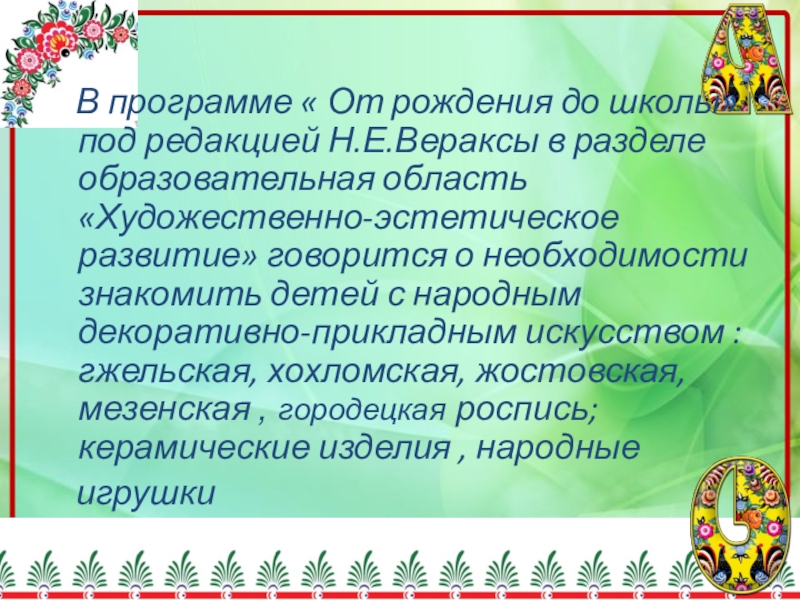 Н.Е.Вераксы в разделе образовательная область «Художественно-эстетическое развитие» говорится о необходимости знакомить детей с народным декоративно-прикладным искусством : гжельская, хохломская, жостовская, мезенская , городецкая роспись; керамические изделия , народные