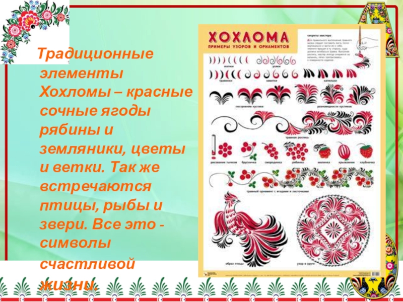 Слайд 7 Традиционные элементы Хохломы – красные сочные ягоды рябины и