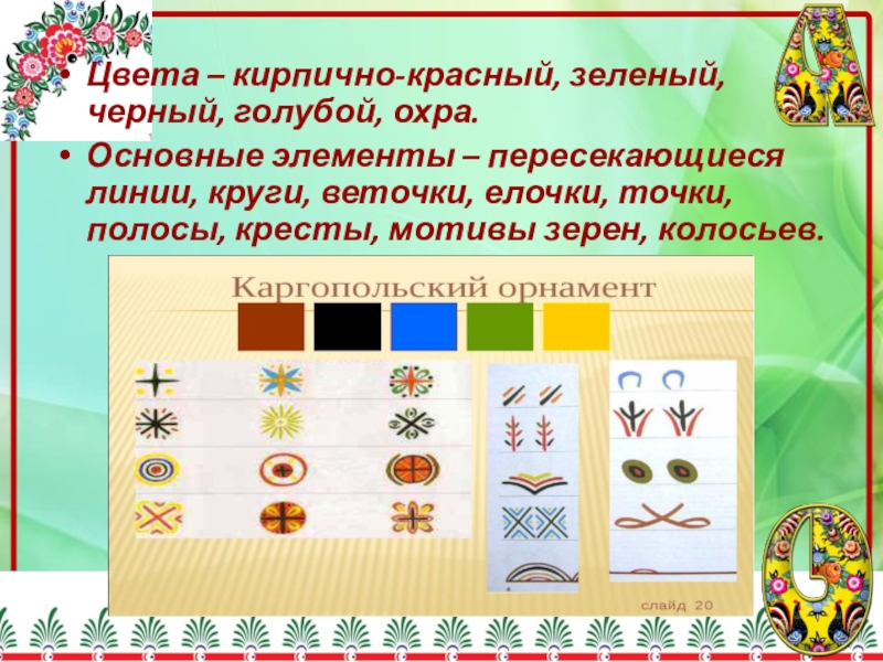 Слайд 24Цвета – кирпично-красный, зеленый, черный, голубой, охра.