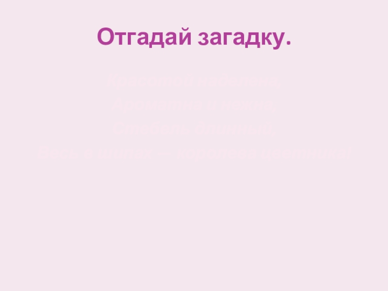 Отгадай загадку.Красотой наделена,Ароматна и нежна,Стебель длинный,Весь в шипах — королева цветника!