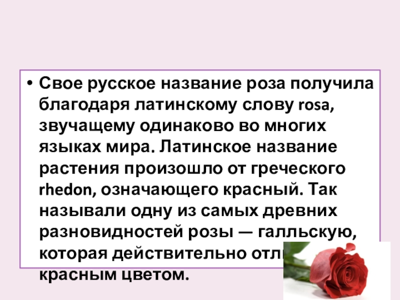 Слайд 4Свое русское название роза получила благодаря латинскому слову rosa, звучащему одинаково