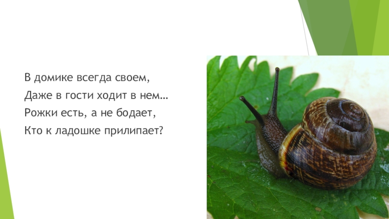 В домике всегда своем,Даже в гости ходит в нем… Рожки есть, а не бодает, Кто к ладошке