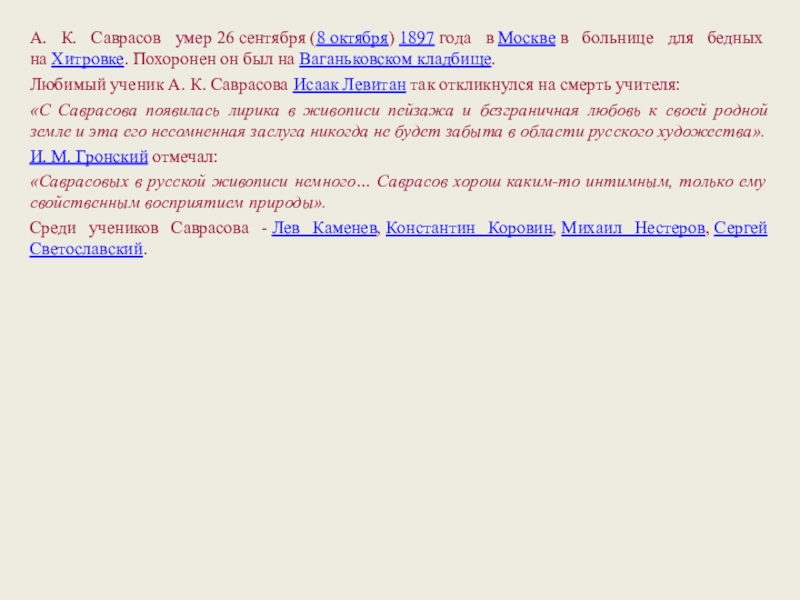 Слайд 6А. К. Саврасов умер 26 сентября (8 октября) 1897 года в Москве в больнице для бедных на Хитровке. Похоронен он