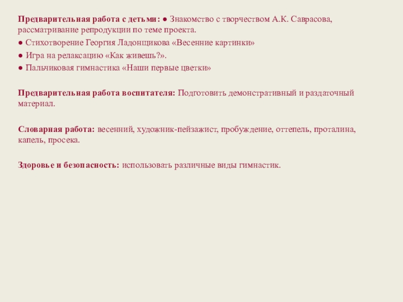 Слайд 3Предварительная работа с детьми: ● Знакомство с творчеством А.К. Саврасова, рассматривание