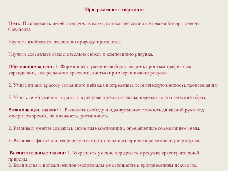 Цель: Познакомить детей с творчеством художника-пейзажиста Алексея Кондратьевича Саврасова.
