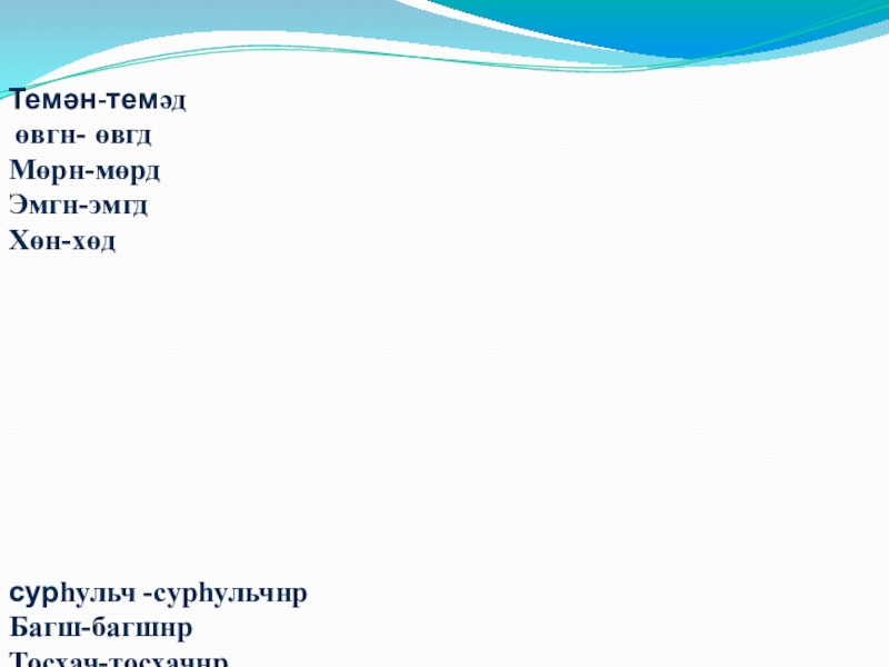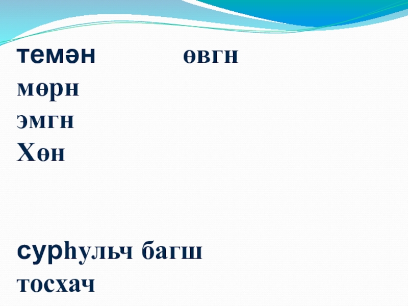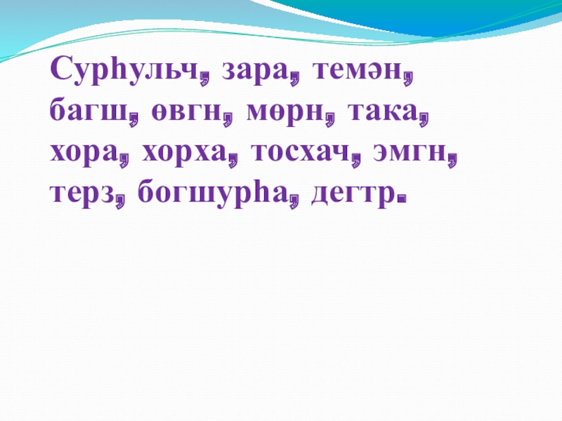 Слайд 9Сурһульч, зара, темән, багш, өвгн, мөрн, така, хора, хорха, тосхач, эмгн,
