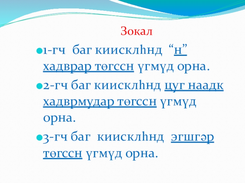 Зокал1-гч баг киисклһнд “н” хадврар төгссн үгмүд орна.2-гч баг киисклһнд цуг наадк хадврмудар төгссн үгмүд орна.3-гч баг