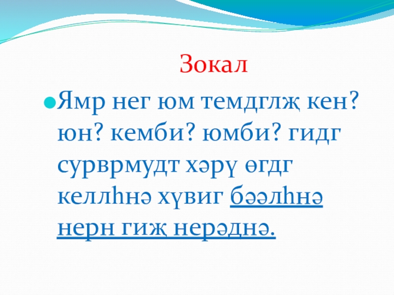 ЗокалЯмр нег юм темдглҗ кен? юн? кемби? юмби? гидг сурврмудт хәрү өгдг келлһнә хүвиг бәәлһнә нерн гиҗ