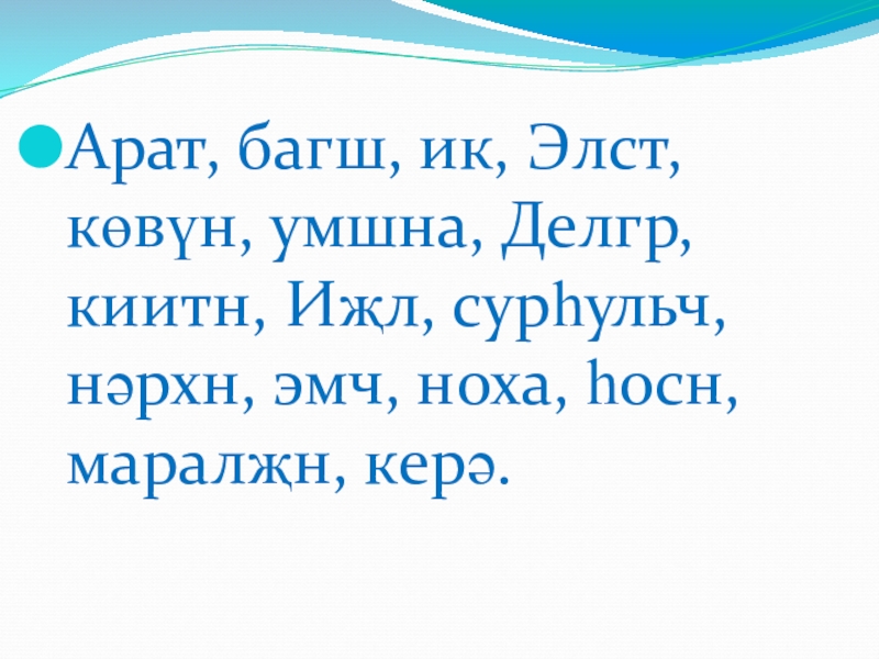 Слайд 3Арат, багш, ик, Элст, көвүн, умшна, Делгр, киитн, Иҗл, сурһульч, нәрхн,