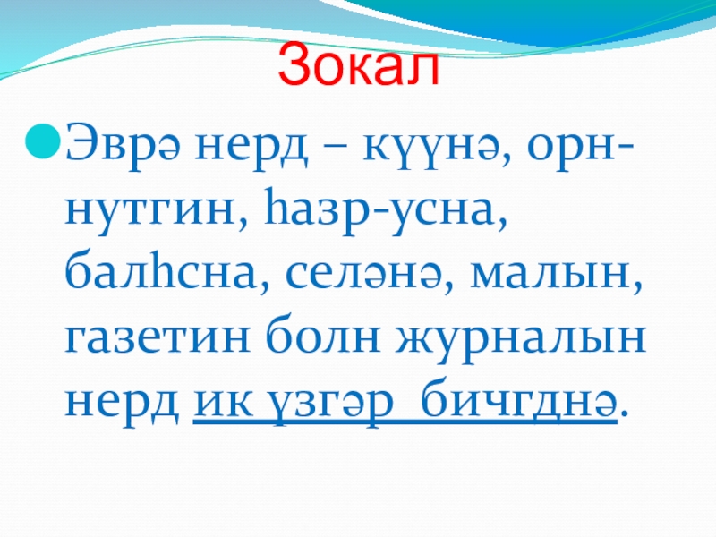 ЗокалЭврә нерд – күүнә, орн-нутгин, һазр-усна, балһсна, селәнә, малын, газетин болн журналын нерд ик үзгәр бичгднә.