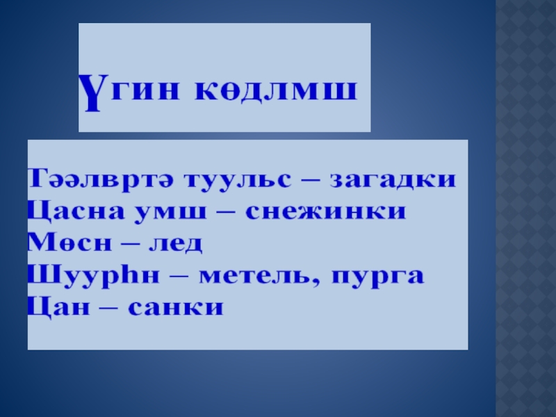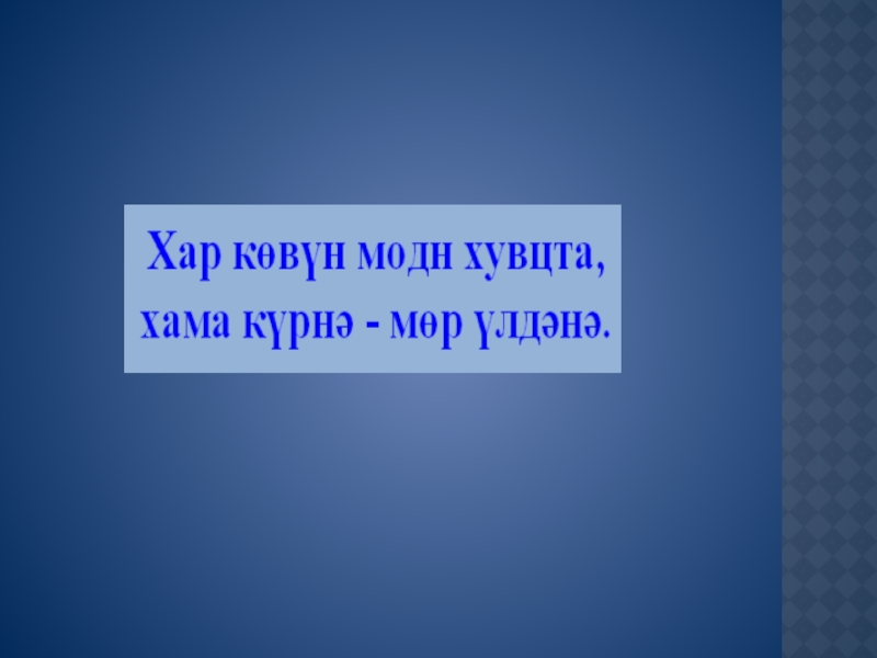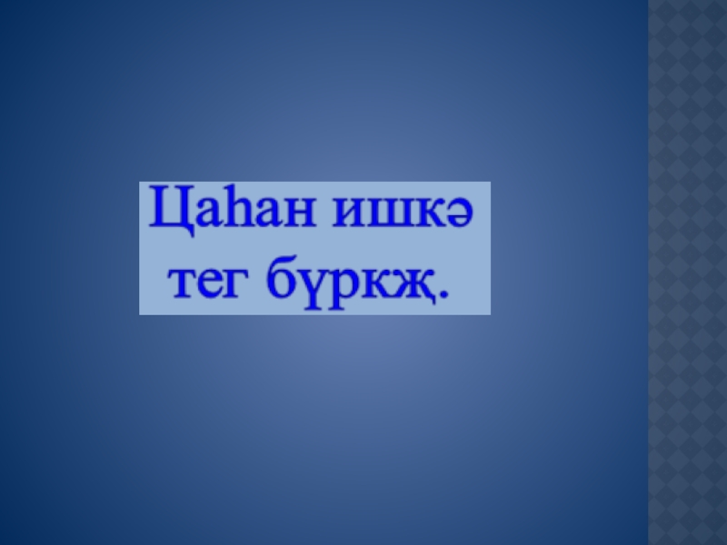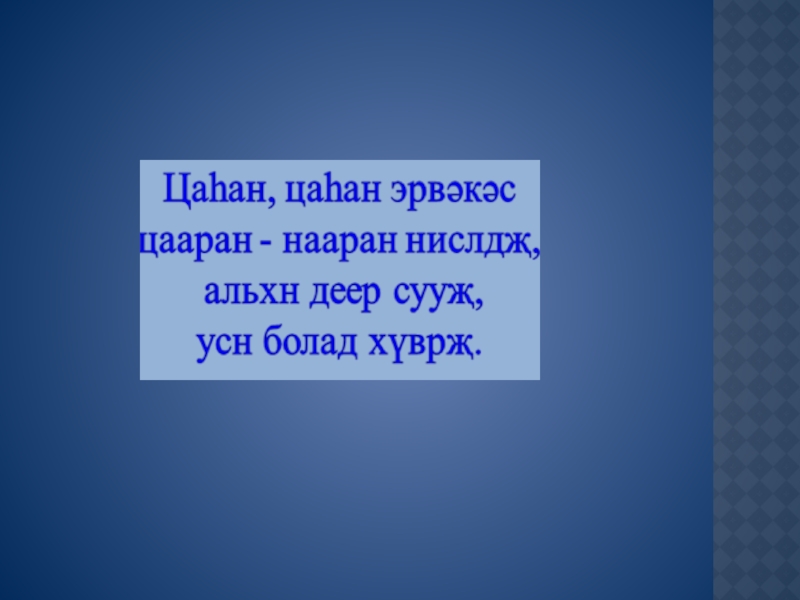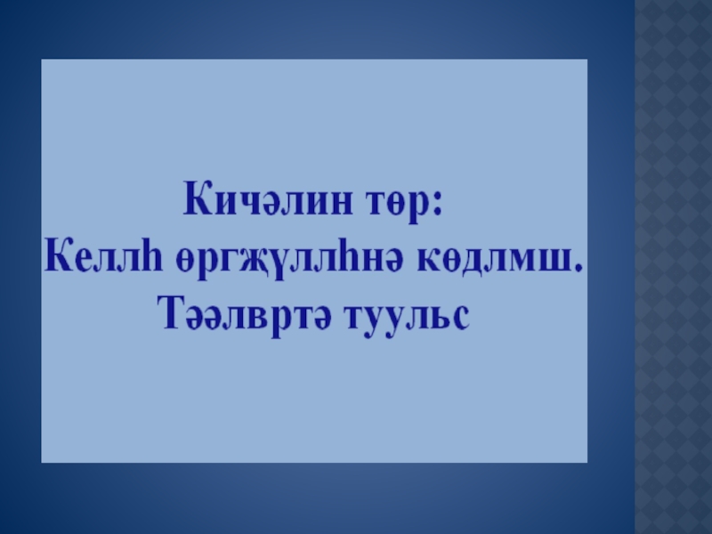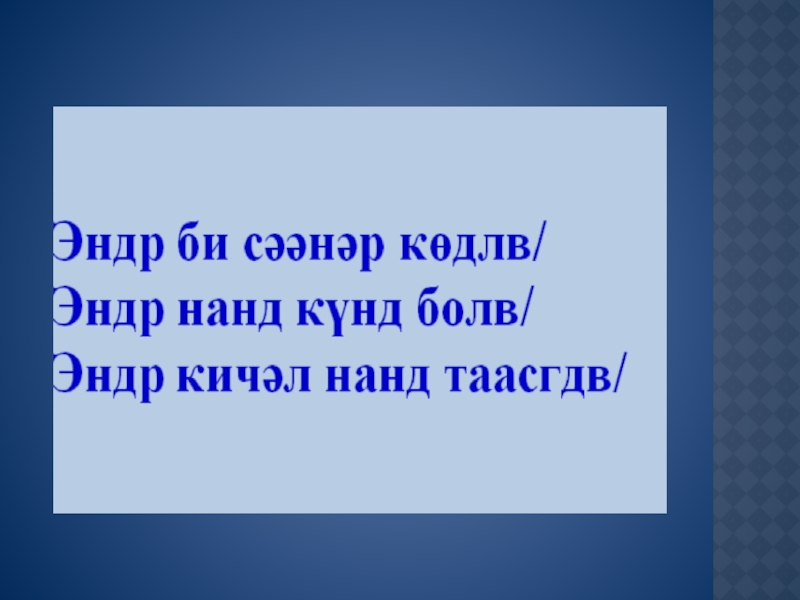 Эзн Богд җаңһр ханЭргндкән ширтәд хәләнә.Барун талагшан хәләһәд,Байн Күңкән Алтн Чееҗлә мендлнә.Зүн талагшан хәләһәд,Зөргтә Арслңгин Арг Улан