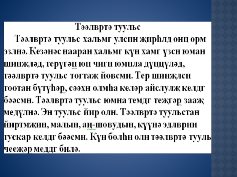 Эзн Богд җаңһр ханЭргндкән ширтәд хәләнә.Барун талагшан хәләһәд,Байн Күңкән Алтн Чееҗлә мендлнә.Зүн талагшан хәләһәд,Зөргтә Арслңгин Арг Улан Хоңһрла мендлнә.Деегшән хәләһәд, Деедс Бурхндан зальврна.Дорагшан хәләһәд, һазр-усндан зальврна.