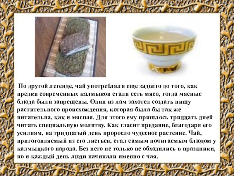 как предки современных калмыков стали есть мясо, тогда мясные блюда были запрещены. Один из лам захотел создать пищу растительного происхождения, которая была бы так же питательна, как и мясная. Для этого ему пришлось тридцать дней читать специальную молитву. Как гласит предание, благодаря его усилиям, на тридцатый день проросло чудесное растение. Чай, приготовляемый из его листьев, стал самым почитаемым блюдом у калмыцкого народа. Без него не только не обходились в праздники, но и каждый день люди начинали именно с чая.