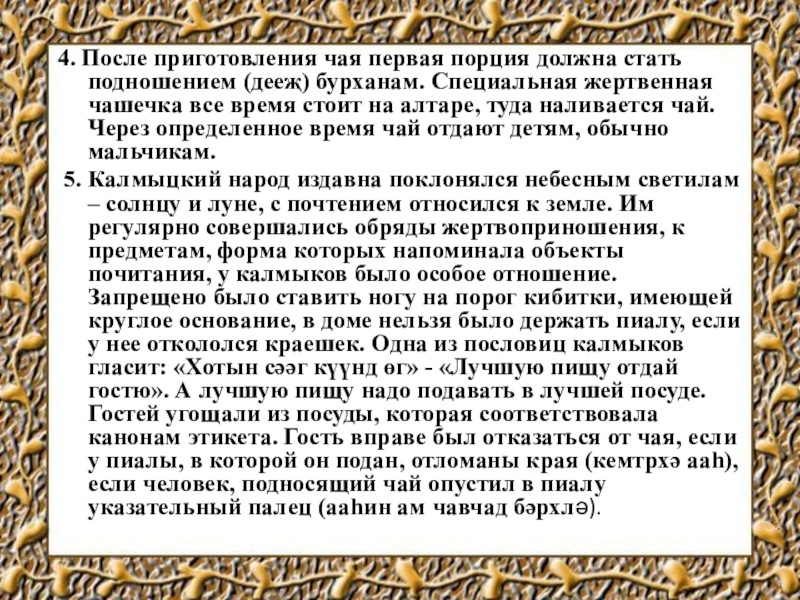 5. Калмыцкий народ издавна поклонялся небесным светилам – солнцу и луне, с почтением относился к земле. Им регулярно совершались обряды жертвоприношения, к предметам, форма которых напоминала объекты почитания, у калмыков было особое отношение. Запрещено было ставить ногу на порог кибитки, имеющей круглое основание, в доме нельзя было держать пиалу, если у нее откололся краешек. Одна из пословиц калмыков гласит: «Хотын сəəг күүнд ɵг» - «Лучшую пищу отдай гостю». А лучшую пищу надо подавать в лучшей посуде. Гостей угощали из посуды, которая соответствовала канонам этикета. Гость вправе был отказаться от чая, если у пиалы, в которой он подан, отломаны края (кемтрхə ааh), если человек, подносящий чай опустил в пиалу указательный палец (ааhин ам чавчад бəрхлə).