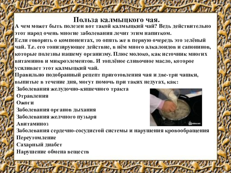 Если говорить о компонентах, то опять же в первую очередь это зелёный чай. Т.е. его тонизирующее действие, в нём много алкалоидов и сапонинов, которые полезны нашему организму. Плюс молоко, как источник многих витаминов и микроэлементов. И топлёное сливочное масло, которое усиливает этот калмыцкий чай.