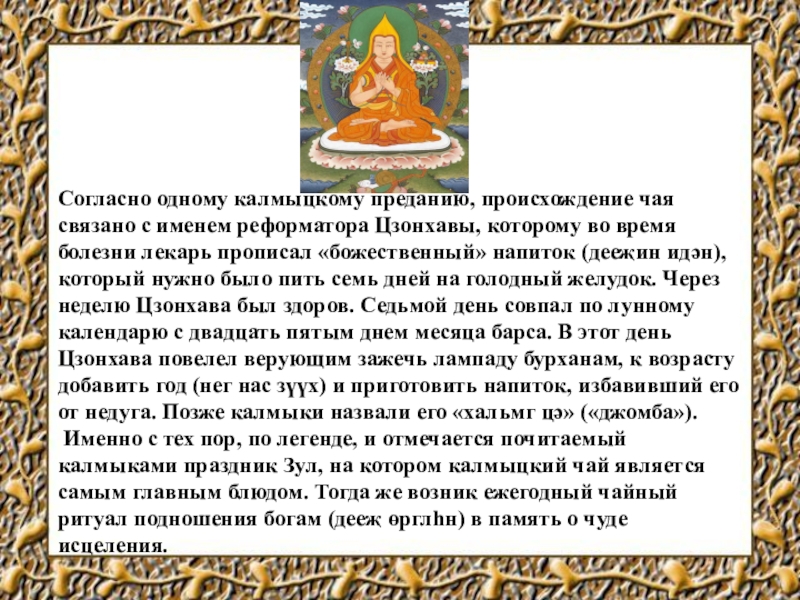 Слайд 3Согласно одному калмыцкому преданию, происхождение чая связано с именем реформатора Цзонхавы,