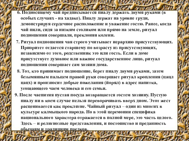 9. После чаепития пустая посуда возвращается гостем хозяину. Пустую пиалу ни в коем случае нельзя переворачивать вверх дном. Этот жест расценивается как проклятие. Чайный ритуал – один из многих в культуре калмыцкого народа. Но в этой церемонии специфика национального характера отражается в полной мере, это часть целого. Здесь – и религиозные представления, и постоянство и преданность обычаям и традициям предков.