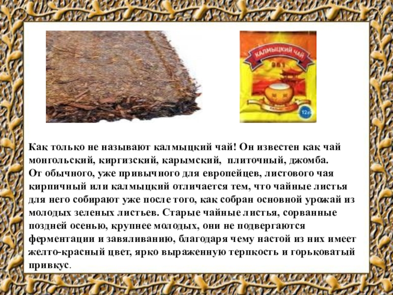 тоже есть разные блюда, но одним из самых почитаемых является калмыцкий чай, или как его ещё называют джомба.