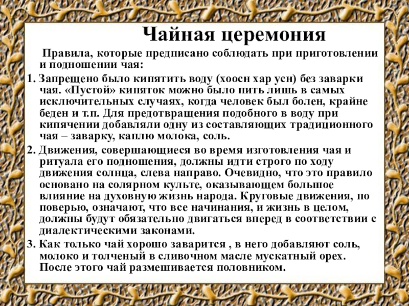 1. Запрещено было кипятить воду (хоосн хар усн) без заварки чая. «Пустой» кипяток можно было пить лишь в самых исключительных случаях, когда человек был болен, крайне беден и т.п. Для предотвращения подобного в воду при кипячении добавляли одну из составляющих традиционного чая – заварку, каплю молока, соль.