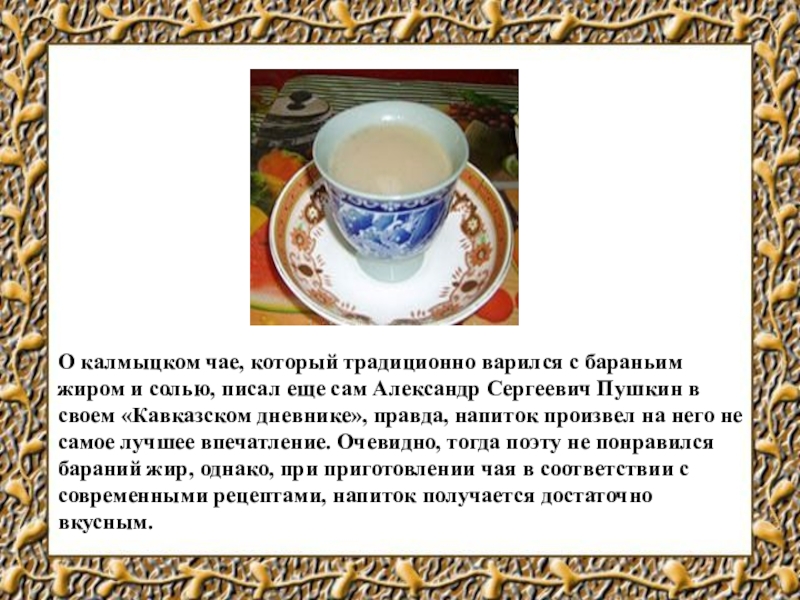 солью, писал еще сам Александр Сергеевич Пушкин в своем «Кавказском дневнике», правда, напиток произвел на него не самое лучшее впечатление. Очевидно, тогда поэту не понравился бараний жир, однако, при приготовлении чая в соответствии с современными рецептами, напиток получается достаточно вкусным.