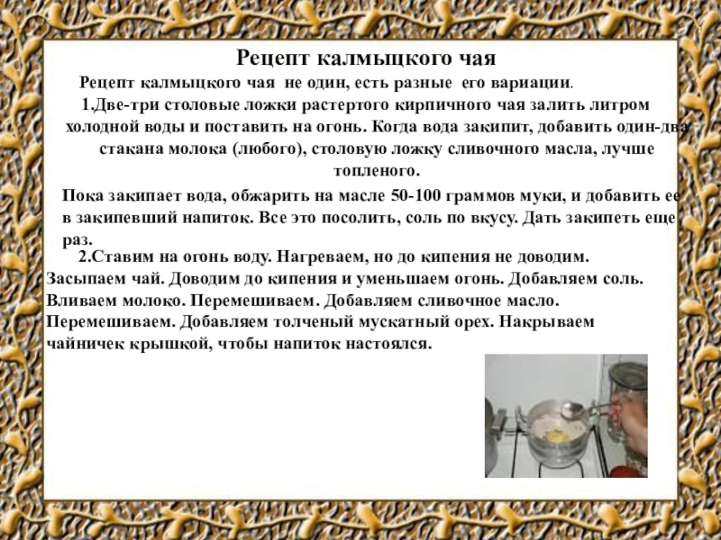 Рецепт калмыцкого чая не один, есть разные его вариации.
