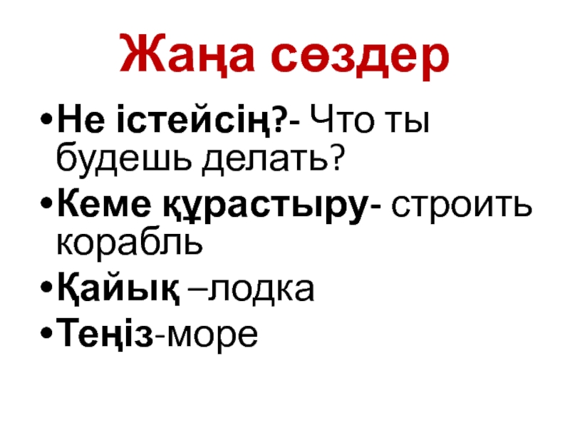 Жаңа сөздерНе істейсің?- Что ты будешь делать?Кеме құрастыру- строить корабльҚайық –лодкаТеңіз-море